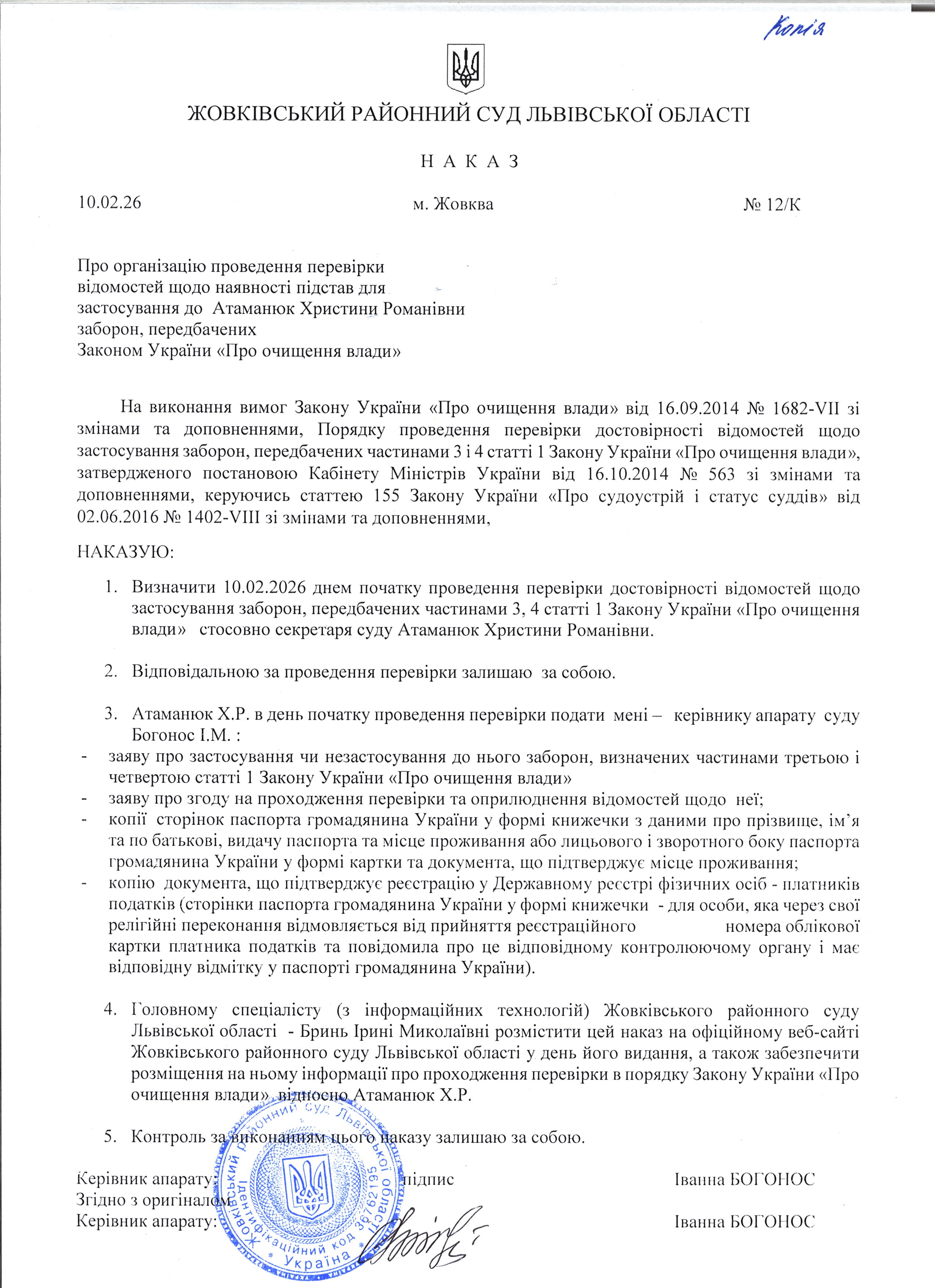 На виконання вимог Закону України «Про очищення влади» інформуємо про те, що розпочато перевірку стосовно: