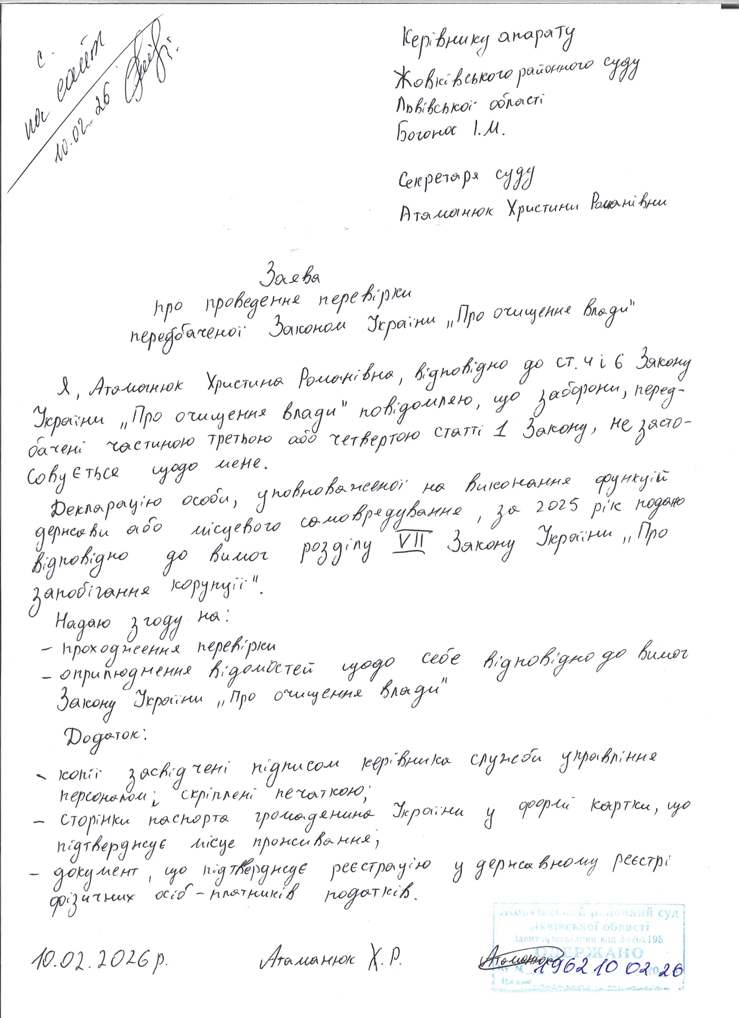 Атаманюк Христини Романівни - секретаря суду Жовківського районного суду Львівської області.
